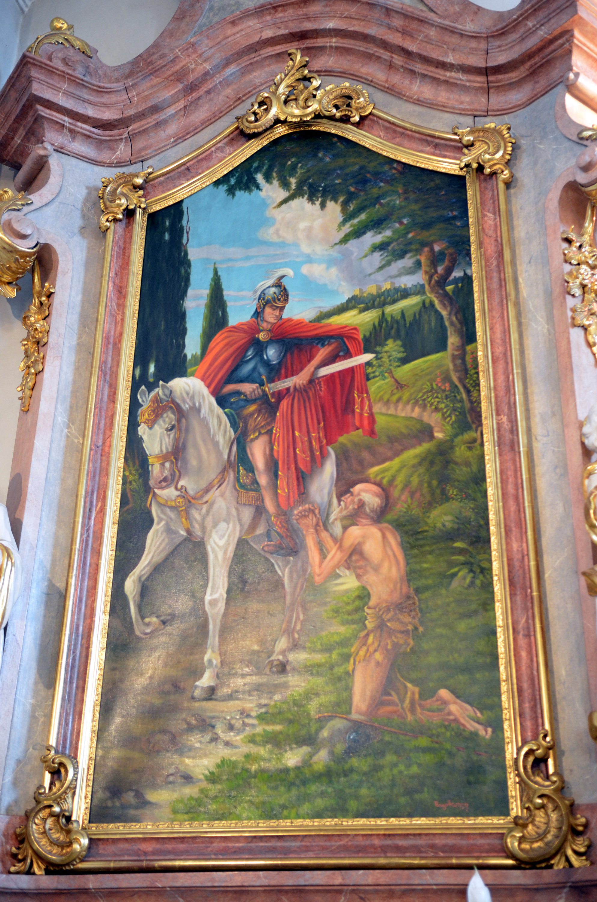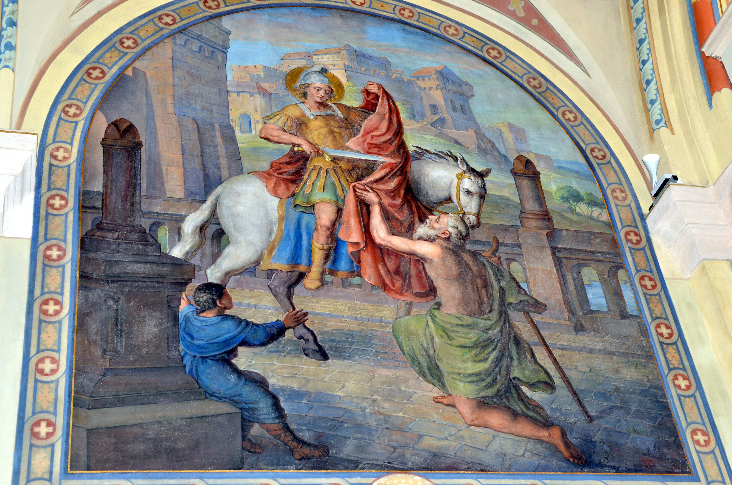 Da Martin weder Geld noch Essen bei sich hatte, griff er nach seinem Offiziersmantel, zerteilte ihn mit seinem Schwert in der Mitte und gab eine Hälfte dem vor Kälte zitternden Bettler.